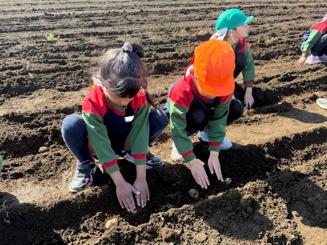 先生の話を聞いて、じゃがいもを置き土をかぶせました。最後にみんなで「立派なじゃがいもになりますように!」とお願いしました。